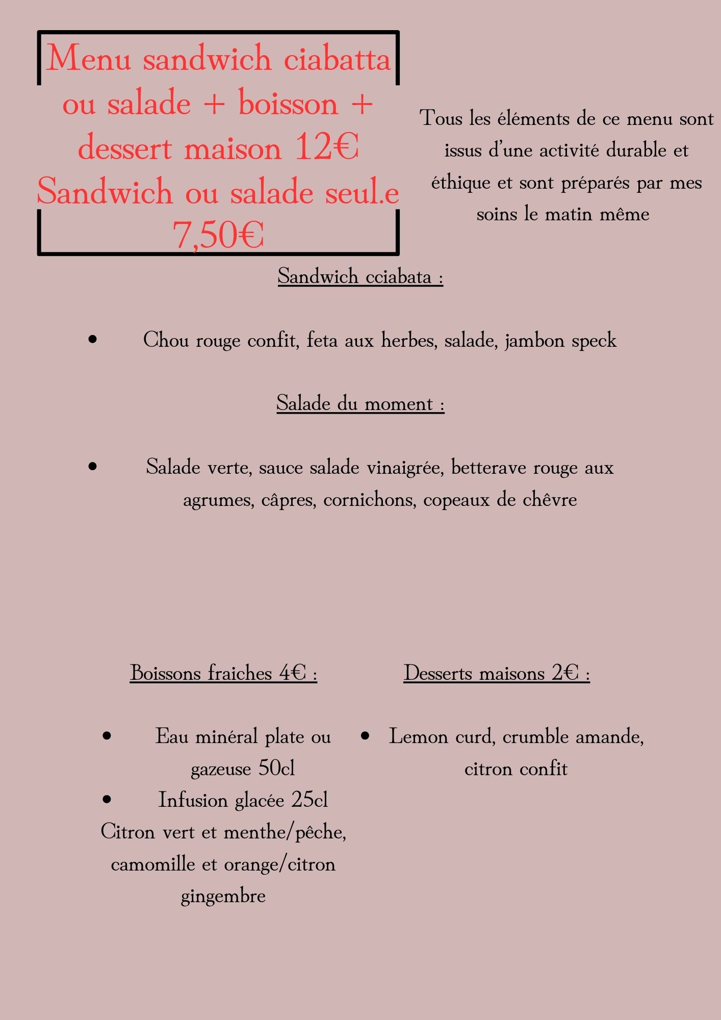 Venez vous restaurer pendant votre pause déjeuner avec notre formule sandwich ! Il fait trop chaud pour un sandwich? Prenez notre salade du moment disponible également dans la formule.